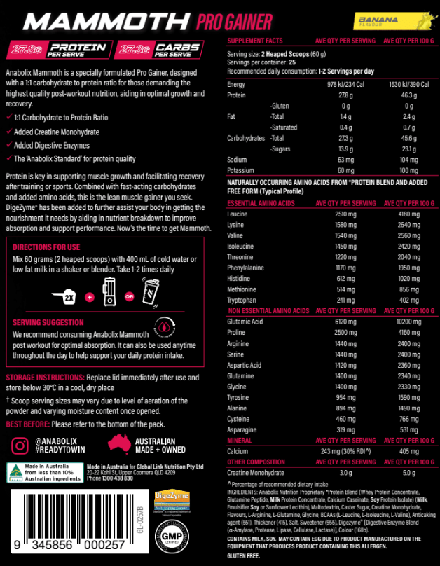 This is "the beast of mass gainers" brought to you from the Anabolix Nutrition stable of products. Mammoth is the future of mass builders. With a scientifically formulated protein-to-carbohydrate blend of 50 to 50, Mammoth is designed for you to gain "mammoth" muscle mass without the unwanted fat. This combination exceeds the standards of regular mass gainers and then some, it’s no wonder it's called Mammoth.
