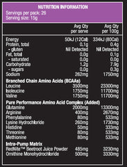 • This product conains a scientifically formulated blend of Amino Acids plus RedNiteTM Beetroot Juice Powder to provide you with a pure performance edge during your workout