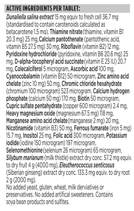 - Dunaliella salina (betacarotene 1.5 mg) extract equivalent to fresh cell 37.5 mg