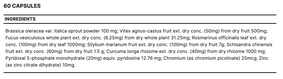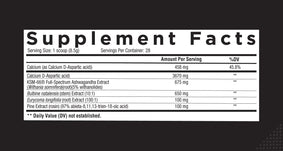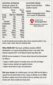 Organic Lepidium meyenii (Maca) root powder, Organic Cacao Powder, Organic Banana Resistant Starch Powder, Organic Shatavari (Asparagus racemosus) root ext, Organic Ashwagandha KSM-66® (Withania somnifera) root ext, Organic Shilajit, Organic Tremella fruiting body powder, Lactobacillus acidophilus, Natural chocolate flavours, Coconut milk powder, Cocoa powder, Erythritol, Stevia, Xanthan gum, Pyridoxine hydrochloride.