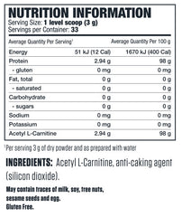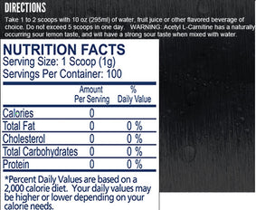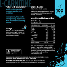 GENETIX NUTRITION 100% Pure Acetyl L Carnitine plays a vital role in fatty acid metabolism for energy. 100% Pure Acetyl-L-Carnitine crosses the blood-brain barrier, providing direct benefit to the central nervous system and assists in maintaining healthy brain and mental function.