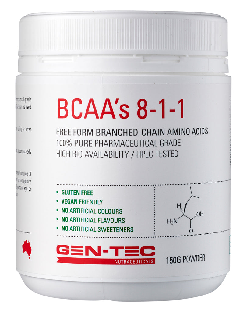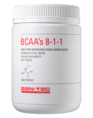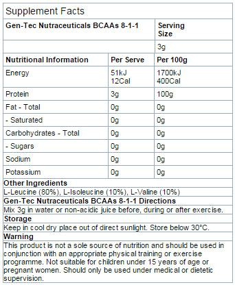 Gen-Tec Nutrition BCAAs 8-1-1 is comprised of three essential amino acids, L-leucine, L-isoleucine and L-valine. They are essential for building and maintaining muscles, and work by facilitating the synthesis of proteins in the body. They account for about 1/3 of muscle protein, and can be used directly by the muscles for energy. BCAAs are needed during times of physical stress, so are often used as bodybuilding and athletic supplements.