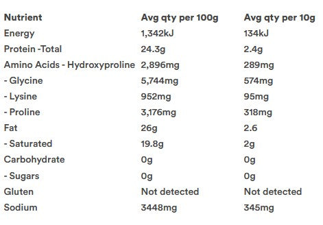 100% Grass-Fed Beef Bones, Naturally Evaporated Sea Salt, Medium Chain Triglycerides, Matcha Green Tea Blend (Water, Organic Japanese Matcha Green Tea, Ground Cinnamon, Olive Leaf Powder, Siberian Ginseng, Cayenne Pepper), Chilli Powder.
