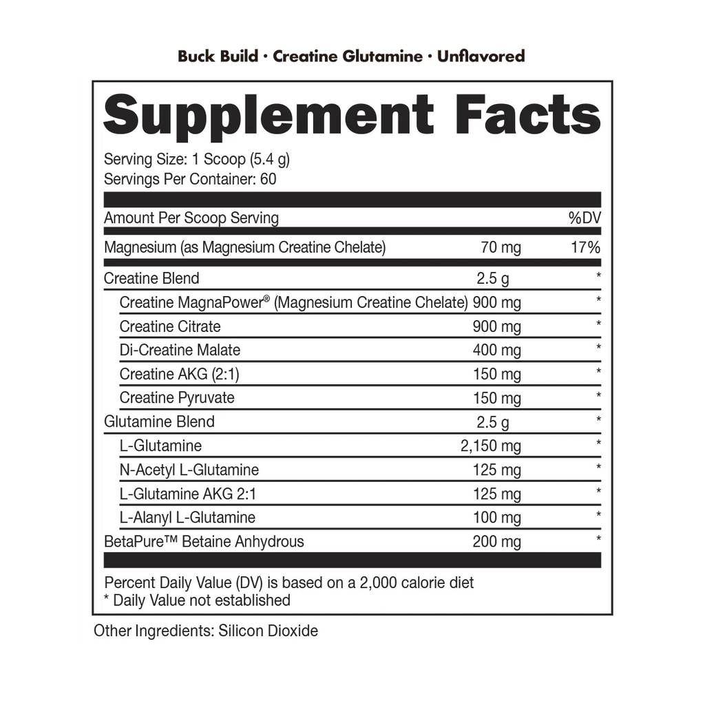 Elevate your workout game with Buck Build by Bucked Up, a cutting-edge creatine powder designed for serious gym enthusiasts. Buck Build features a unique five-creatine blend, including Creatine MagnaPower®, to potentially enhance muscle growth, cognitive function and output. Plus, with added L-Glutamine for enhanced recovery support, this ground-breaking formula could provide the key to unlocking unparalleled performance and dominance in the gym.