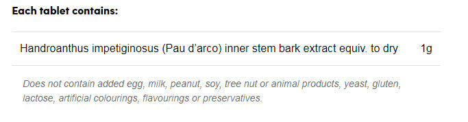 - 1g of Handroanthus impetiginosus inner stem bark extract equivalent to dry (Pau d’arco).