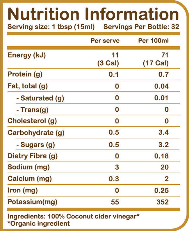 Our Natural Coconut Cider Vinegar is made from defatted and high protein coconut milk and contains amino acids from the coconut sap. It is also rich in acetic acid, providing an alkaline effect which improves functioning of all body systems.