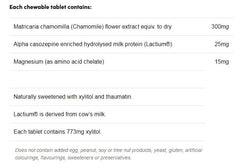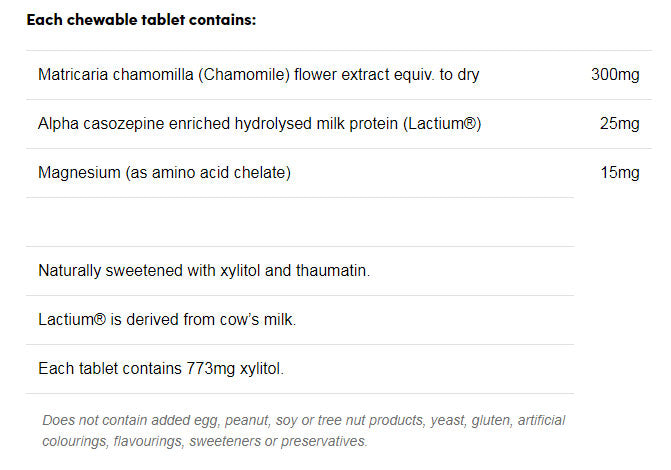 This chewable tablet contains natural flavours and tooth-friendly sweetener xylitol. The added chamomile has been traditionally used in Western herbal medicine to help soothe and calm children, as well as to assist in failing asleep. Chamomile is also used in herbal medicine to relieve digestive discomfort. The added magnesium and lactium will help to maintain a healthy nervous system, so your child is less irritable.