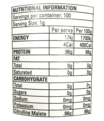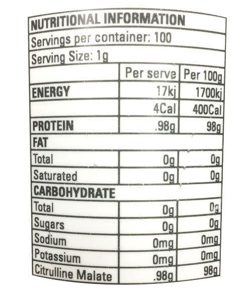 SUGGESTED USE: Mix 1g (1/4 tsp) of CITRULLINE MALATE in 150mL water and consume 20 minutes before exercise. Store in a cool, dry, dark place.