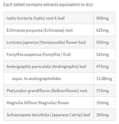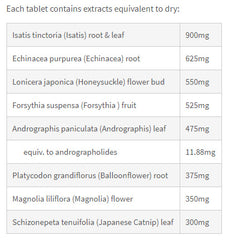 - 900mg of Isatis and 550mg of Honeysuckle to help relieve symptoms of minor upper respiratory tract infections.