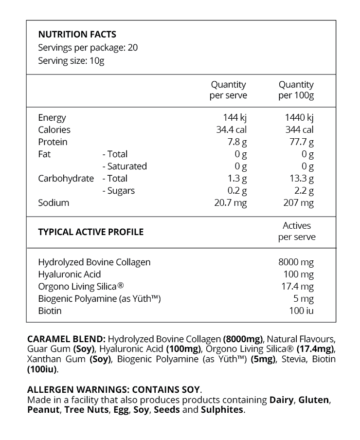 Available in delightful flavours, you can effortlessly incorporate Collagen Complex into your daily routine by adding it to your coffees, smoothies, shakes, or recipes. Each serving of this potent collagen blend contains 8000mg of hydrolysed bovine collagen, 100mg of hyaluronic acid, 17.4mg of Orgono living Silica®, and 100iu of Biotin. This powerful fusion is packed with age-defying ingredients, working to enhance your beauty at a cellular level like never before.