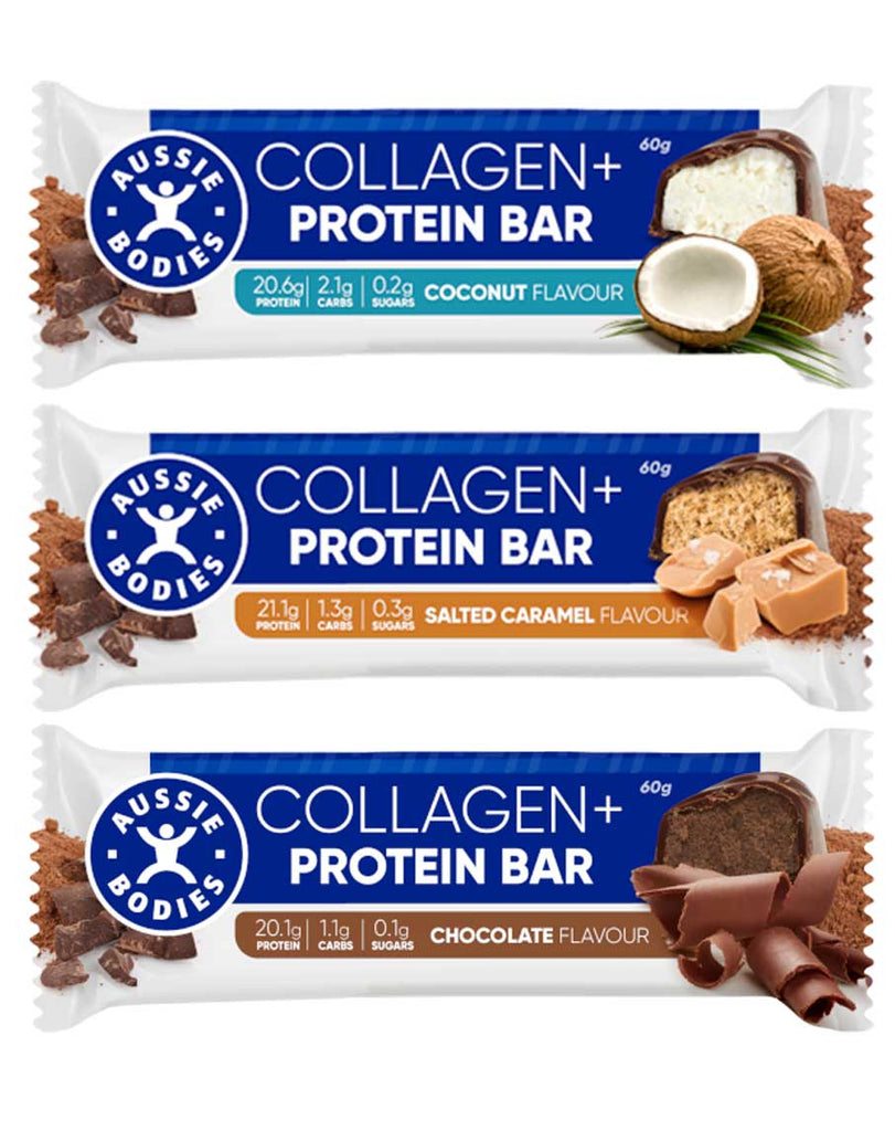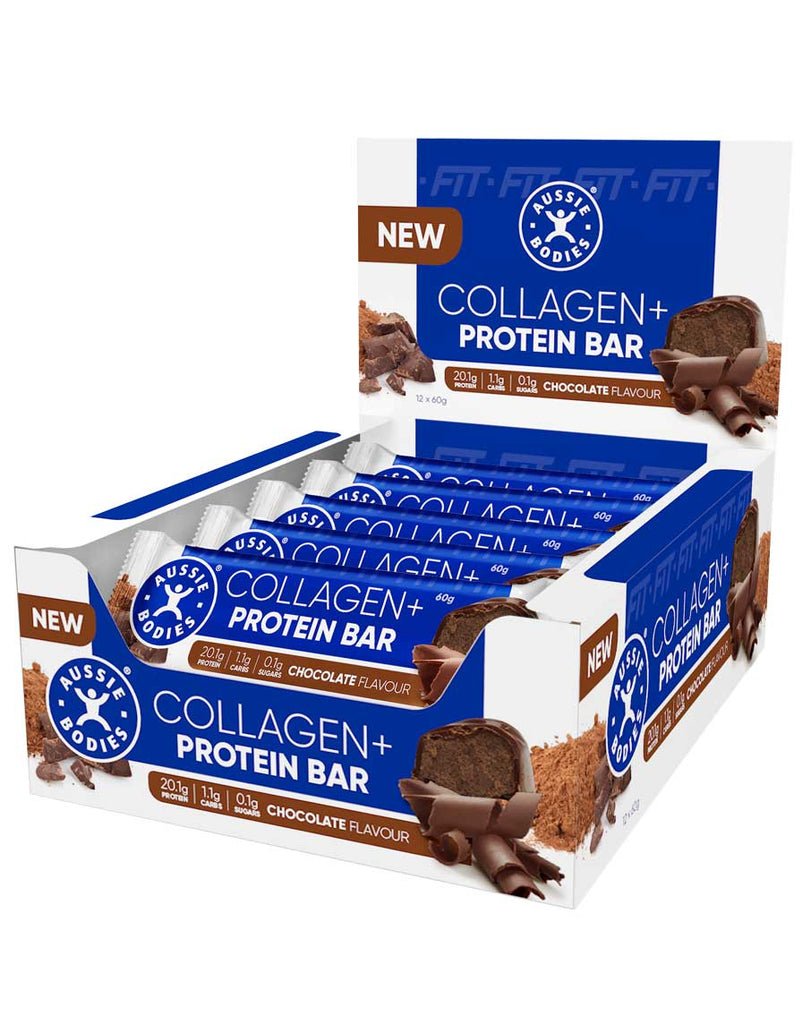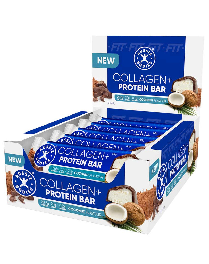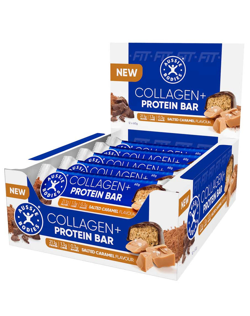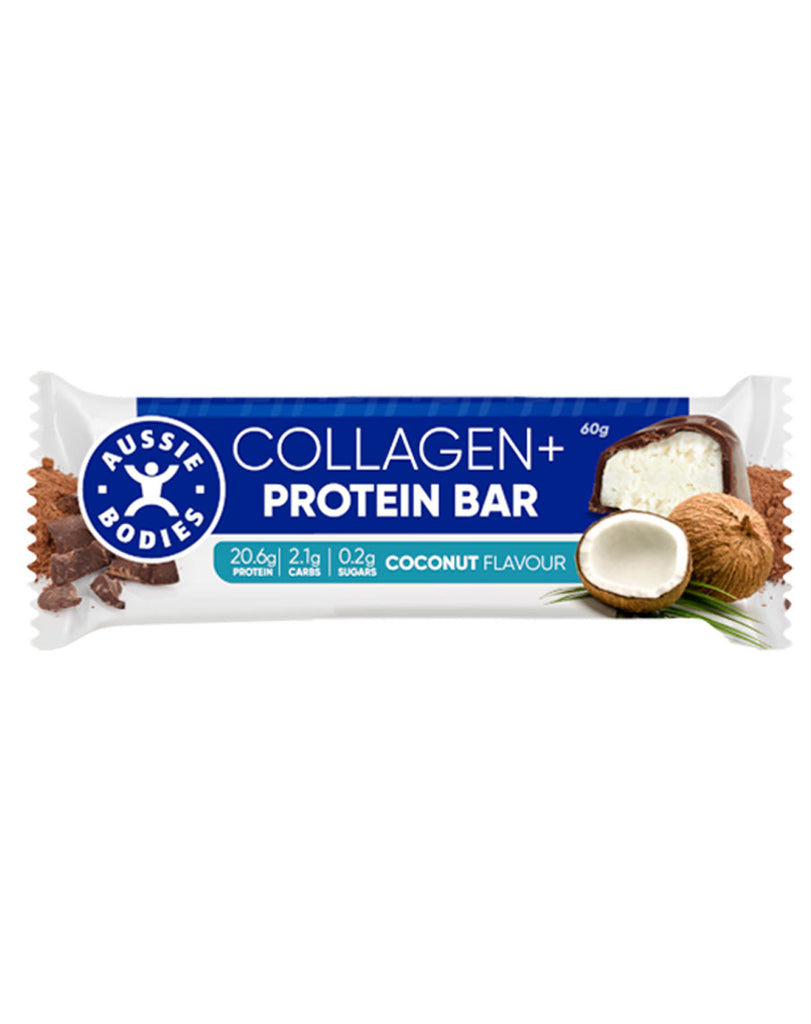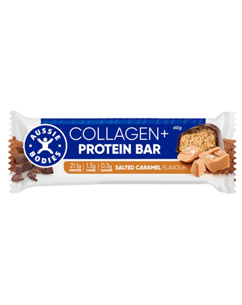 Aussie Bodies crafted a protein bar with added collagen to support joint health. Collagen is found in cartilage, joints, ligaments and muscle. The body naturally creates collagen, and over time, this production tends to slow down. You can naturally get collagen from foods including chicken skin, pork skin, beef and fish.