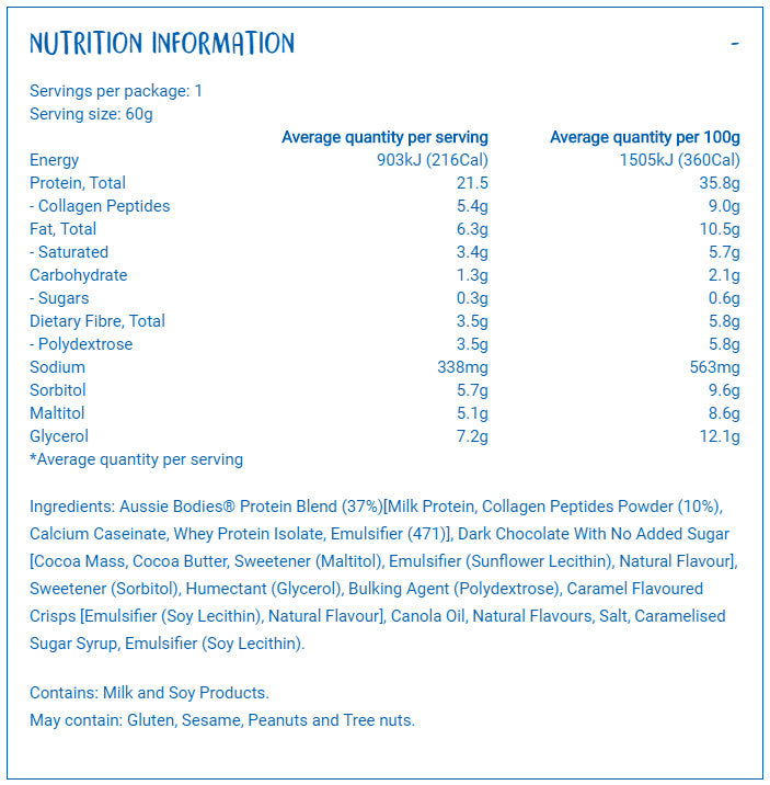 Each serve (60g) Collagen + Protein Bar by Aussie Bodies has: