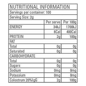INGREDIENTS: 100% Pure Bovine COLOSTRUM (20%IgG).