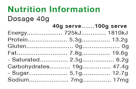 Handmade in Melbourne. Australian made + owned. Made in a kitchen that handles nuts. Keep it cool. Refridgerate in warm climate. See 'Storage' for more information.