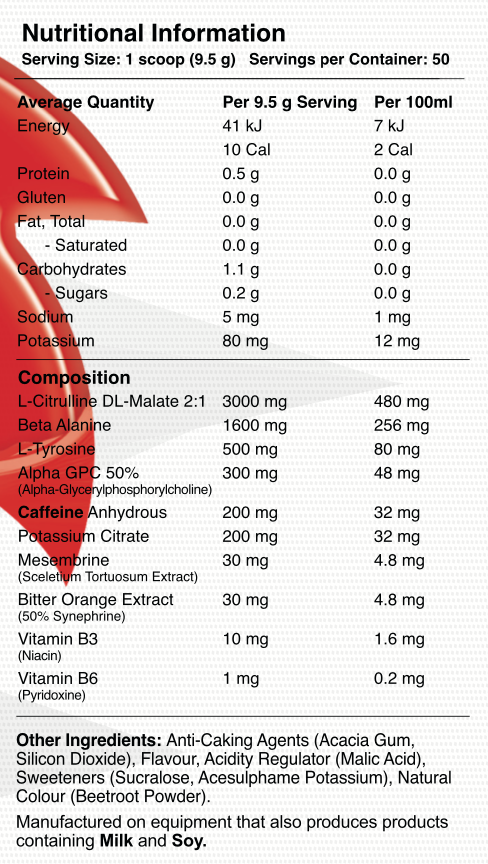 Directions: Add one serving to 400ml of water. Consume 20 to 30 minutes prior to training. Do not exceed more than one serving per day.