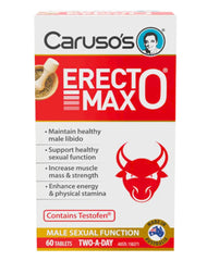 Caruso's ErectOMax formula supports healthy sexual function and reproductive system health and maintains healthy testosterone levels in healthy males. This formula is an herbal and nutritional preparation for men that has specifically been developed to support healthy testosterone levels and sexual function in healthy males, as well as helping to maintain a healthy libido in healthy males. Caruso's ErectOMax also helps to improve energy levels and stamina, assisting with muscle strength and muscle performance.