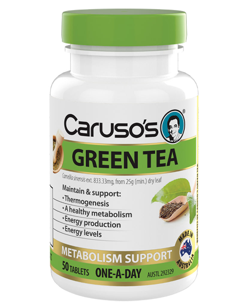 Caruso’s Green Tea is a convenient one-a-day formula that provides a high potency dose of Green Tea, which has been standardised to the active constituent and natural antioxidant, Epigallocatechin-3-0-gallate (EGCG). Caruso's Green Tea promotes energy levels and assists with the maintenance of thermogenesis, metabolism and also supports calorie burning.