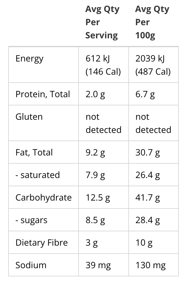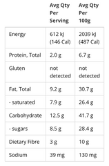 - Contains 9.9g of fat and 3.7g of dietary fibre