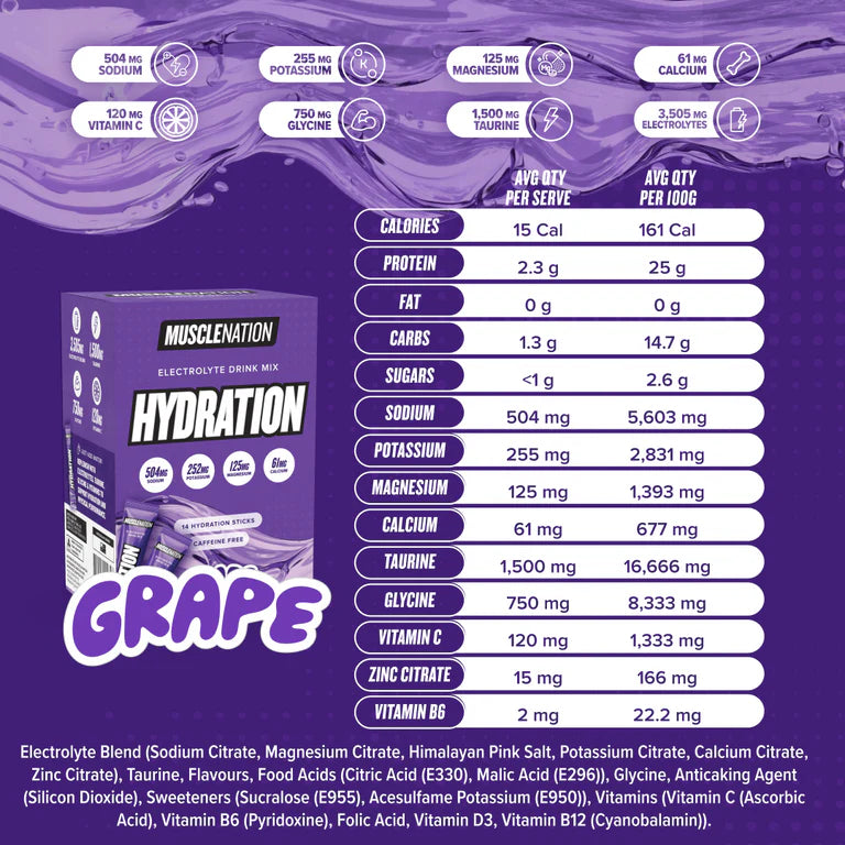 Stay consistently refreshed with Hydration Sticks by Muscle Nation, crafted to support hydration anytime, anywhere. These single-serve sachets are a simple solution for active individuals who want to maintain their water intake throughout the day. With a crisp grape flavour and convenient format, they’re perfect for staying hydrated before, during or after a workout, or whenever you’re on the move. Hydration Sticks by Muscle Nation mix quickly into water, delivering a light, enjoyable drink that makes it easier to stay on top of your hydration goals without any hassle.