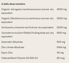 A vegan-friendly, high potency immune tonic with organic Astragalus, Siberian ginseng, Quercetin, Zinc, Vegan Vitamin D3, medicinal herbs and Reishi mushroom to support the immune system to fight illness, relieve fatigue and increase vitality.