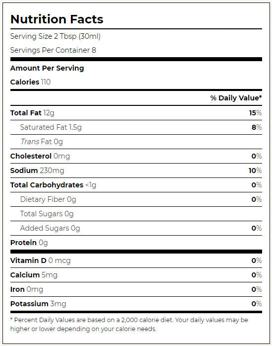 Ingredients - Avocado Oil, Water, Organic Red Wine Vinegar, Sea Salt, Organic Lemon Juice Concentrate,* Organic Onion Powder, Organic Black Pepper, Organic Basil, Organic Garlic Powder, Organic Oregano, Konjac Root, Organic Crushed Red Chile Pepper, Organic Thyme