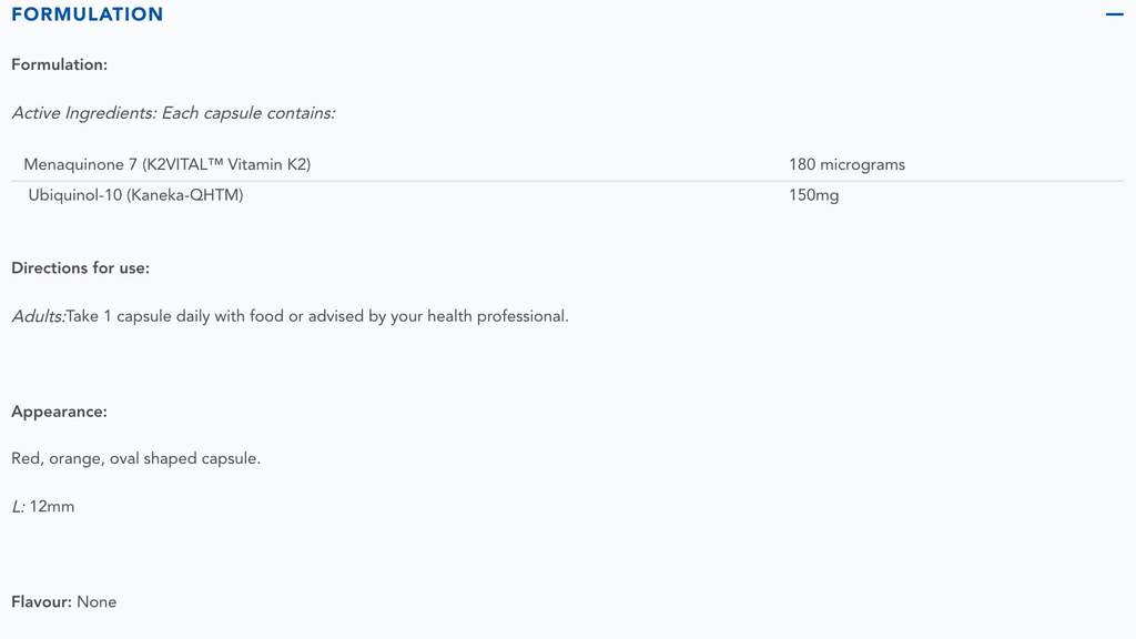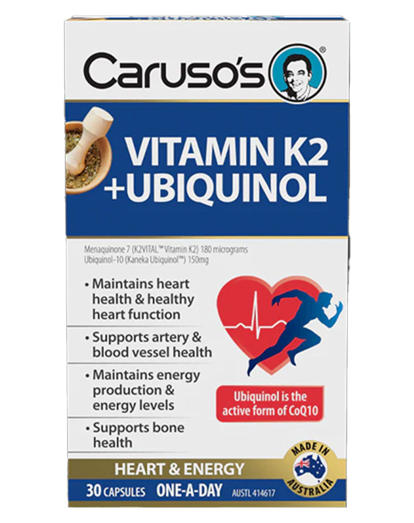 K2 + Ubiquinol by Caruso's Natural Health combines Vitamin K2 and Ubiquinol into a comprehensive formula to potentially enhance various aspects of overall health. This convenient one-a-day supplement offers support for cardiovascular health, promoting heart function, arterial health and blood vessel health. With a Vitamin K2 boost, it extends benefits to bone health by aiding mineralization, metabolism and potential maintenance of bone mass, strength and integrity. K2 + Ubiquinol by Caruso's Natural Health also contributes to the maintenance of energy requirements in adults, providing a holistic approach to vitality. The antioxidant properties complement the formula, offering free radical reduction and additional support for general health.