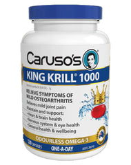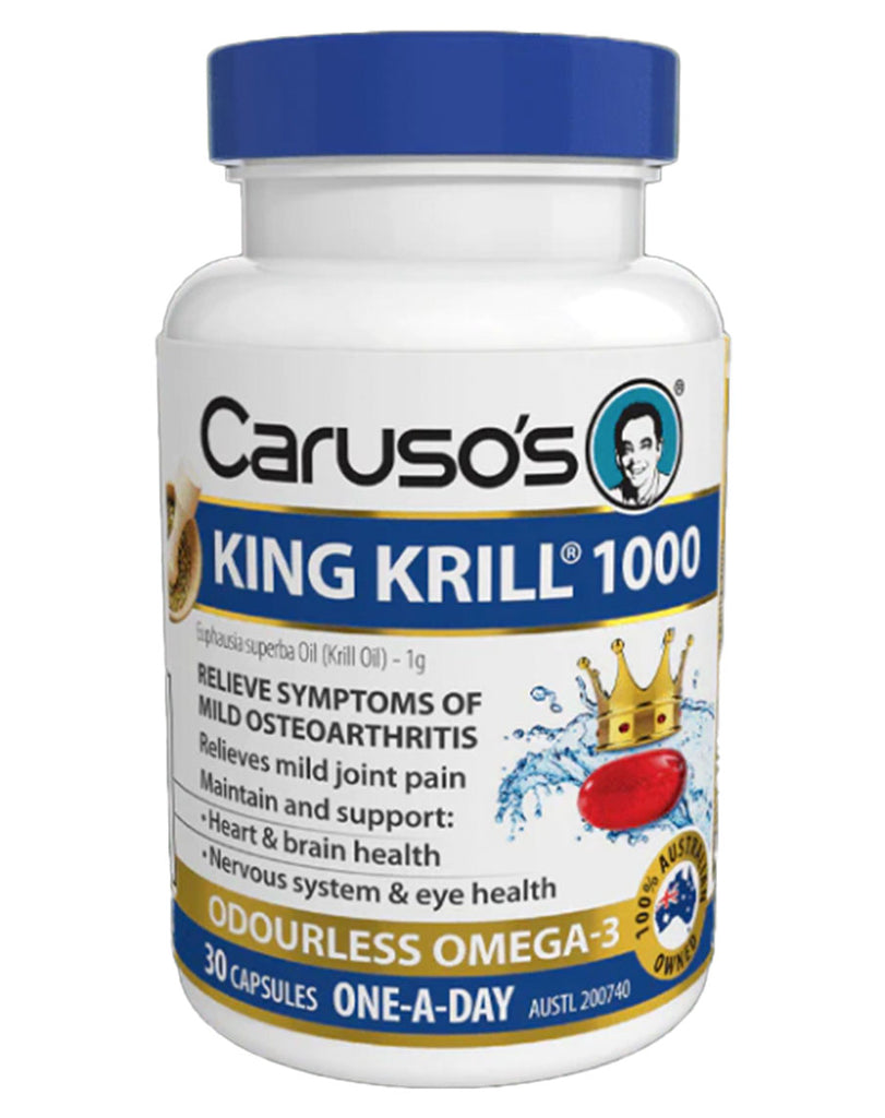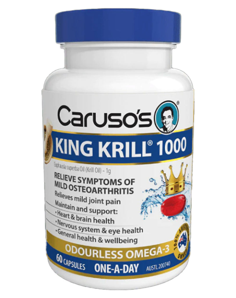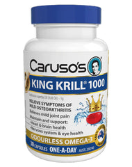 Elevate your general health and wellbeing with Caruso's Natural Health King Krill 1000. Free from artificial colours, dairy, gluten, lactose, nuts, soya bean, sugar and yeast, this supplement offers a convenient alternative to traditional fish oil. With Krill Oil bound to phospholipids, you receive higher levels of Omega-3 Fatty Acids in a smaller dose. Enjoy the combined benefits of EPA and DHA Omega-3 Fatty Acids, supporting cardiovascular health, eye development, brain function and healthy neurotransmission. Caruso's King Krill 1000 also boasts anti-inflammatory properties, making it an excellent choice for mild joint discomfort or conditions like arthritis and osteoarthritis.