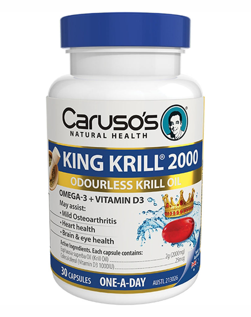 Caruso's King Krill® 2000 is a premium, high-potency supplement crafted for adults who desire a powerful, one-a-day dose of Omega-3 Fatty Acids with the added benefits of Vitamin D3. Featuring a substantial 2000mg dose of Krill Oil, this formula delivers a high-quality blend of Omega-3s that support cardiovascular health, maintain eye health, and boost cognitive function. The inclusion of Vitamin D3 enhances calcium absorption and mineralization, promoting overall bone density and muscle health.
