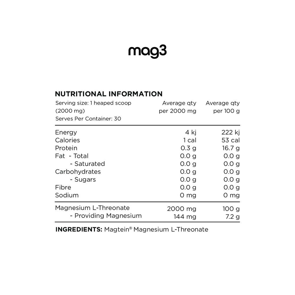 This patented form, Magtein®, combines Magnesium with Threonic Acid, a metabolite of Vitamin C. It is uniquely able to cross the blood-brain barrier, delivering targeted support for brain health, memory, and focus. With its easy-to-use powder format, MAG3 makes customising your magnesium intake simple and convenient.