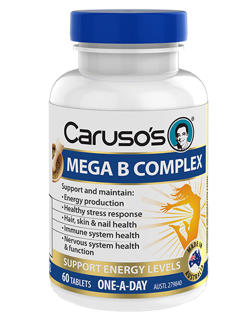 Caruso's Mega B Complex is a high potency one-a-day formula containing eight B vitamins, choline, and inositol to support general health and wellbeing.