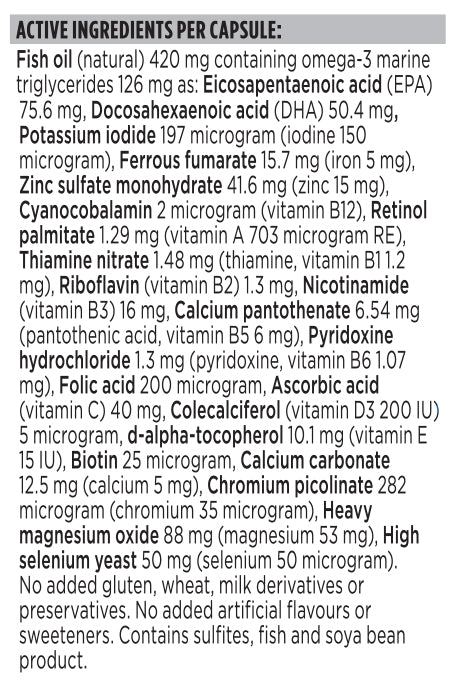 Warning: Vitamins and minerals can only be of assistance if dietary intake is inadequate. If symptoms persist, talk to your health professional. This product contains selenium which is toxic in high doses. A daily dose of 150 micrograms for adults of selenium from dietary supplements should not be exceeded. This product contains Sulfites. The recommended daily amount of vitamin A from all sources is 700 micrograms retinol equivalents for women and 900 micrograms retinol equivalents for men.
