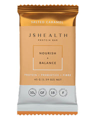 Nourish + Balance Protein Bar by JSHealth Vitamins delivers 10g of organic plant protein, 1 billion CFU probiotics, and low sugar for a balanced, delicious snack. Made with wholefood ingredients, this vegan-friendly, gluten-free bar supports digestion and energy in a satisfying salted caramel flavour.