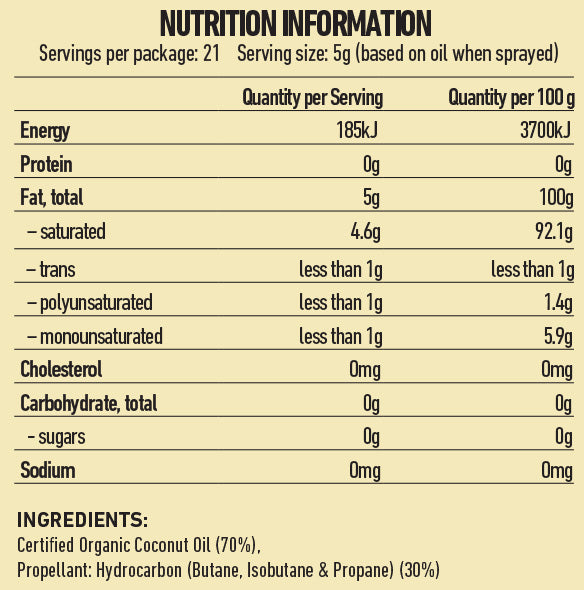 This product is Australia’s first coconut oil spray using Cocolife’s Cold-Pressed Raw Certified Organic Virgin Coconut Oil and food grade gas.