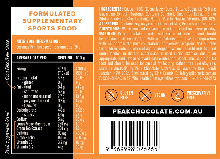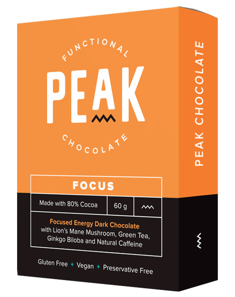 Increase your mental energy from high quality dark chocolate with the performance benefits of the Peak Focus blend of natural Nootropics including Lion’s Mane Mushroom, Green Tea Extract, Ginkgo Biloba, Natural Caffeine and B Vitamins.