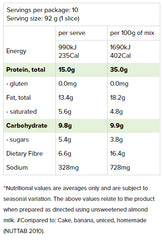 Ingredients: lupin flour, almond meal, rice protein, natural sweeteners (xylitol and stevia), coconut, natural flavours and spices (vanilla, cinnamon, banana, cardamon, allspice), baking powder, salt.