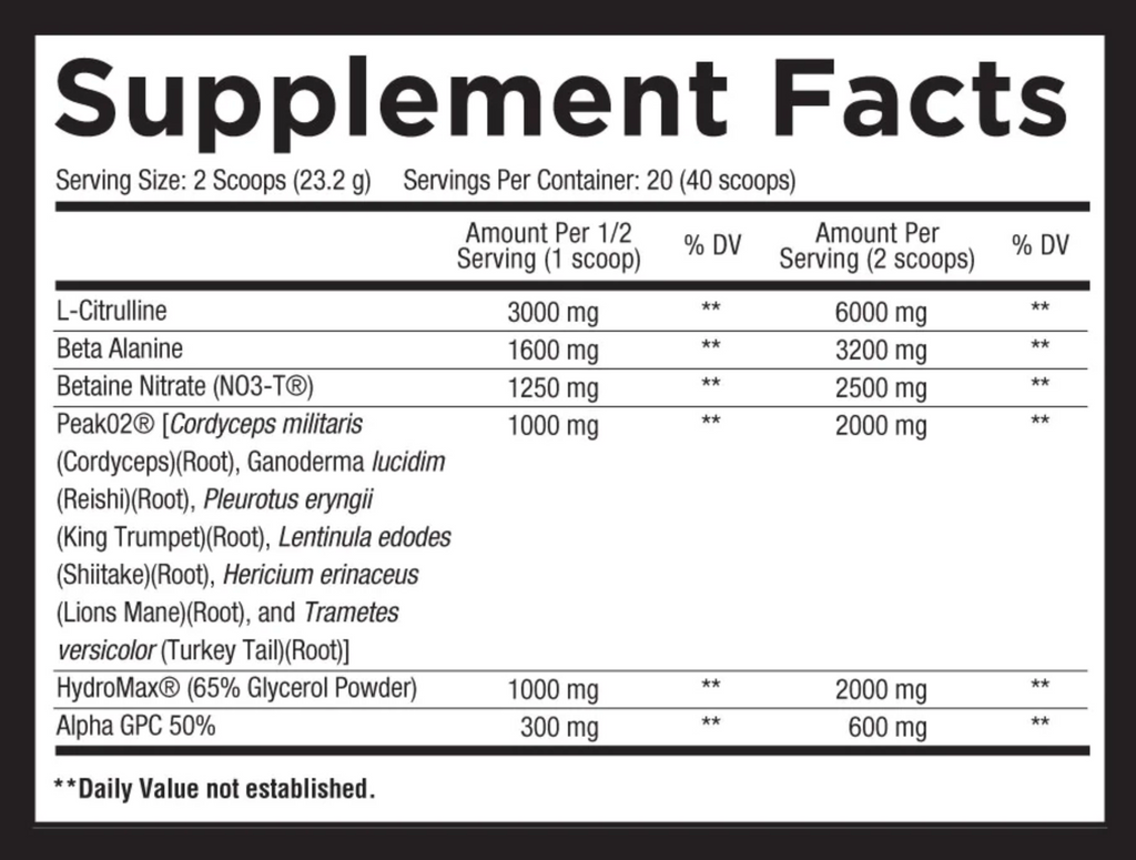 Core PUMP’s emphasis is what we call a “performance pump” – that is, increasing localized blood flow with a purpose. And the purpose is to deliver real, measurable increases to key markers in exercise physiology, such as total time to exhaustion and peak power. We achieve the performance pump in Core PUMP by including ingredients that not only increase dilatory tone – and therefore elicit the “pump” effect – but do so while delivering real performance benefits. Beta Alanine, for example, is well-established to increase endurance, stamina, and peak power output – but it additionally increases blood flow. L-Citrulline is well-established to increase blood flow, but it also increases peak power output. In other words, each ingredient in Core PUMP facilitates the dual purpose behind the performance pump: delivering you the gratifying feeling of a pump but also servicing your goal of progression.
