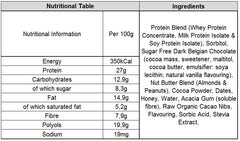 Ingredients: Protein Blend (Egg White, Soy Protein Crisps [Isolated Soy Protein, Rice Flour, Malt Extract and Salt], Micellar Casein, Whey Protein), Dates, Dehydrated Coconut Flower Sap (coconut sugar), Honey, Almond Butter, Peanut Butter, Cocoa Powder, Coconut Oil, Flavour, Dessicated Coconut.