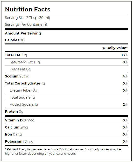 Ingredients - Water, Avocado Oil, Organic Sesame Oil, Organic Apple Cider Vinegar, Organic Distilled Vinegar, Organic Coconut Aminos (Organic Coconut Sap, Sea Salt), Organic Honey, Organic Ginger, Organic Sesame Seeds, Sea Salt, Organic Guar Gum, Organic Coriander, Organic Garlic, Organic Black Pepper