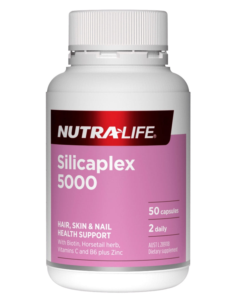 This formula combines 5 key ingredients: Horsetail herb, Biotin, Vitamins C and B6 plus Zinc. Horsetail herb contains naturally occurring Silica. Biotin may support nail and hair health. Vitamin C supports collagen formation, assists in healing and repair of the skin and is necessary for the maintenance of healthy skin. Zinc supports healthy skin renewal processes plus Vitamin B6 supports healthy immune system function. Taken regularly, Nutra-Life Silicaplex 5000 may help to: