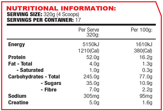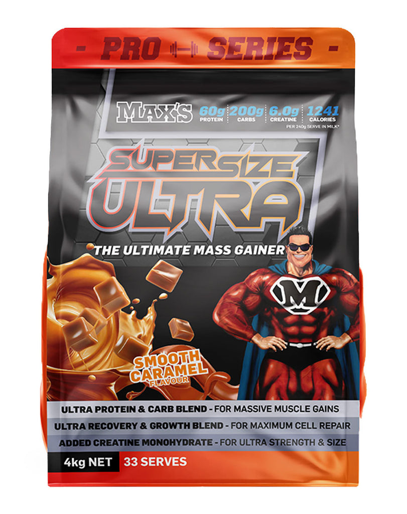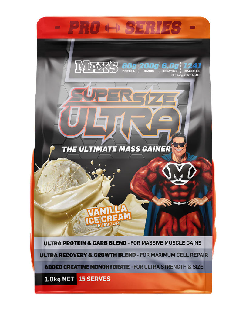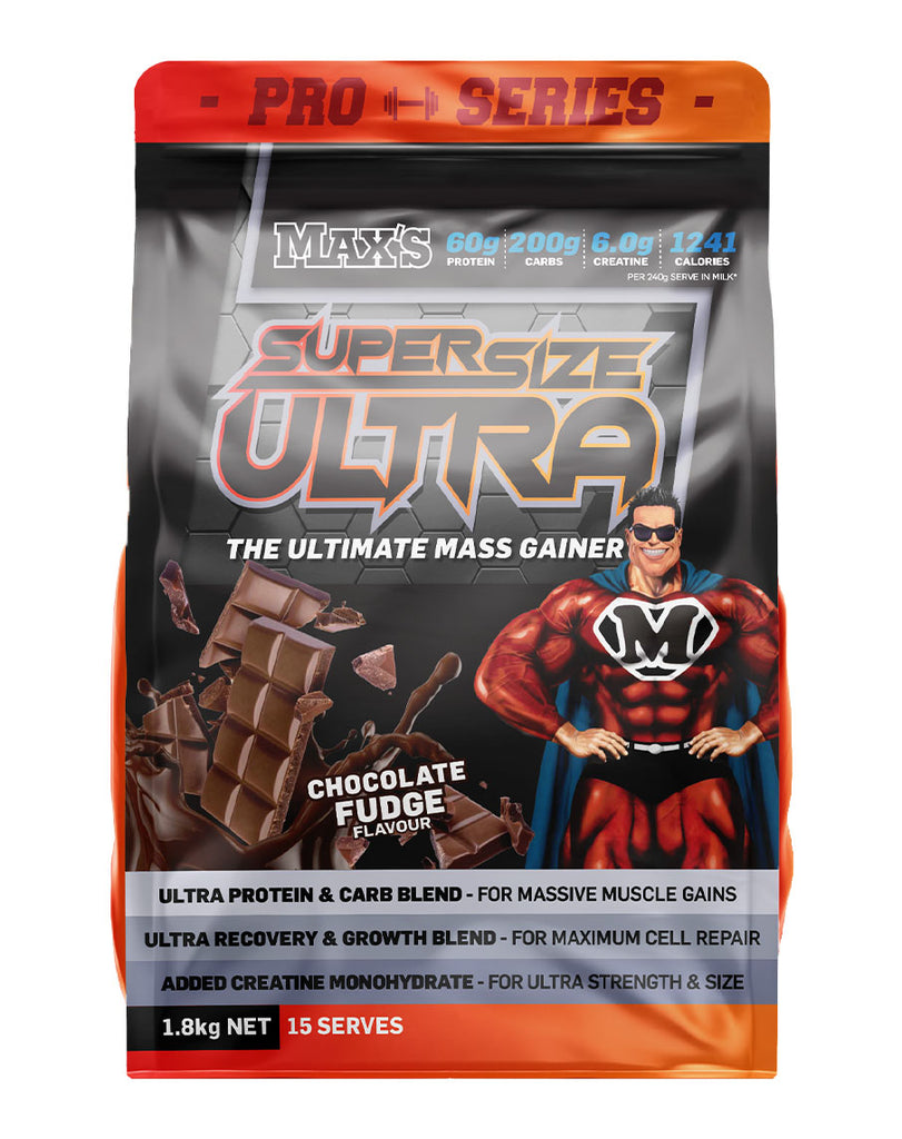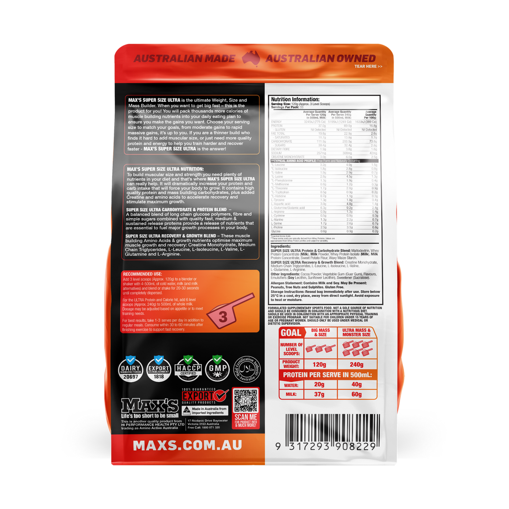 MAX’S SuperSize will push your metabolism anabolic! You will pack thousands of more kilojoules of muscle building nutrients into your daily eating plan to ensure you make the gains you want. Each serves in low-fat milk gives you a massive 800 calories (3400kj) and 51 grams of protein, plus heaps of clean energy carbs to fuel enormous muscle growth and rapid weight gains.