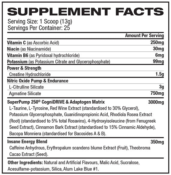 Gaspari Nutrition SuperPump 250 is a pre-workout pump igniter, the new ultimate in energy enhancement with its Insane Energy Blend that features DMAA, intense Xanthine molecules, and mind blowing isomers such as N-phenethyl dimethylamine. Just 1 scoop of SuperPump 250 will give you limitless energy along with unrivaled amounts of concentration and focus.*