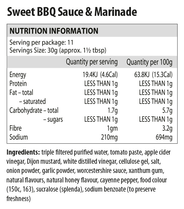 Sweet BBQ Sauce & Marinade by Walden Farms is a delicious & nutritious low calorie sauce to add to your meals. Most marinades are full of sugar which is masked by the salty taste – but Walden Farms just gives you real flavours without the extra unwanted calories. The delicious dressings cut out the fat, carbs and sugar without comprising on flavour. As a perfect addition to the table at meal times, save on hundreds of carbs every day, the Walden way.