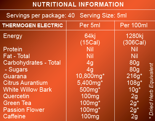 Thermogen Electric incorporates additional herbs designed to assist and support Citrus Auranium and Guarana. These include Willow Bark, Green Tea, and Quercetin - all dissolved in a tangerine flavoured liquid, designed for rapid absorption for FAST results.