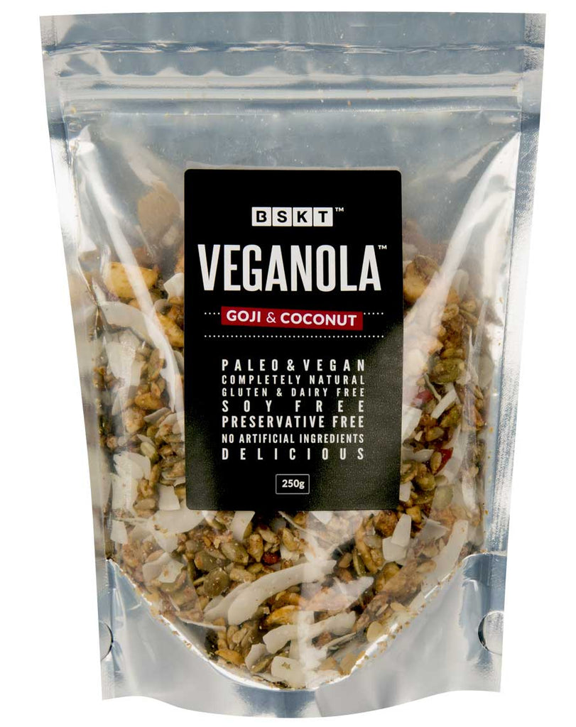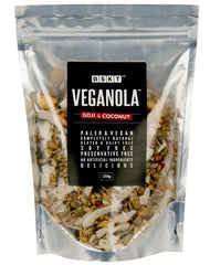 The original and trademarked “Veganola” Made with Premium Nuts, seeds & super fruits inlcuding Macadamias, Coconuts & Goji Berries. This Paleo and Vegan Granola is slow roasted to perfection with natural oils and nectars. Believe us when we say not all Granolas are created equal. Made with the following all natural ingredients: