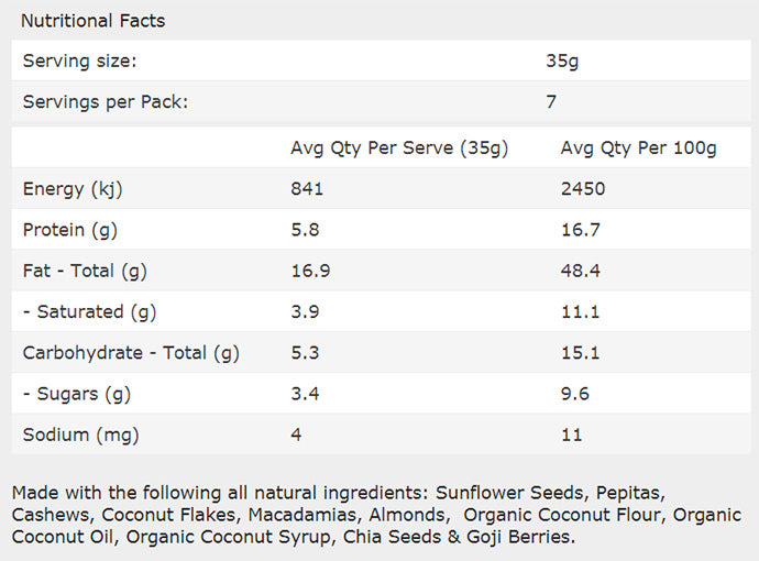 seeds & super fruits inlcuding Macadamias, Coconuts & Goji Berries.