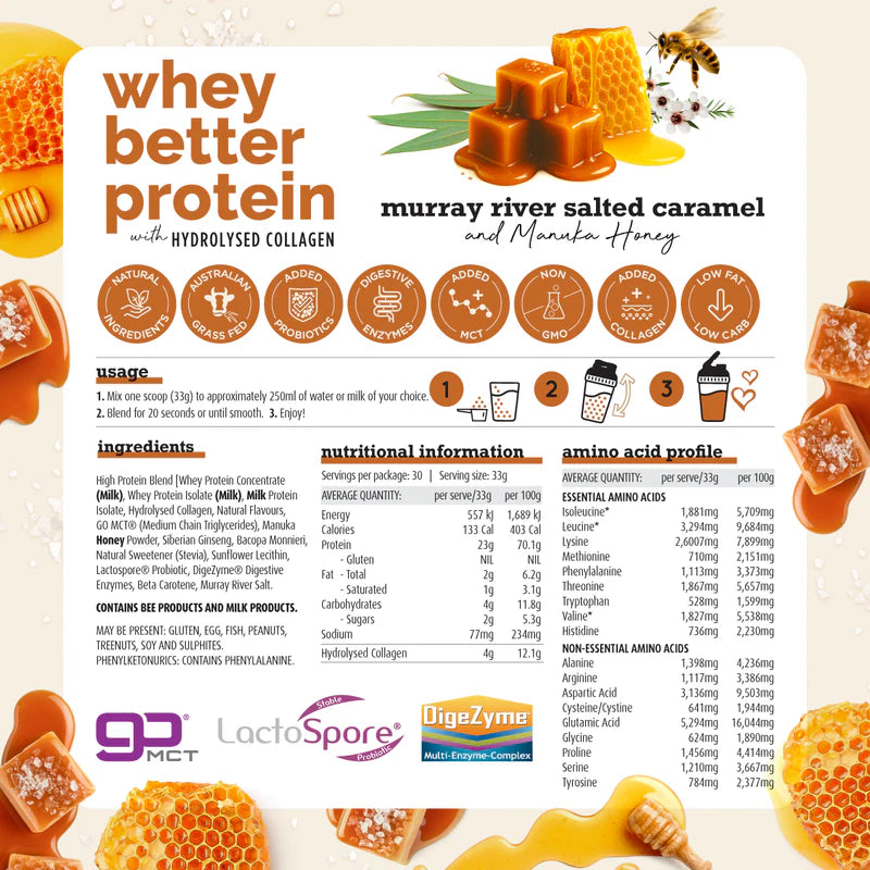 Indulge your daily protein needs with the smooth and satisfying taste of Whey Protein by White Wolf Nutrition in Murray River Salted Caramel. This premium whey protein blend is crafted to complement an active lifestyle, supporting muscle recovery and overall wellness when combined with resistance training. With a naturally creamy texture and a delicious caramel flavour, it's perfect for post-workout shakes, morning oats, or creative baking.